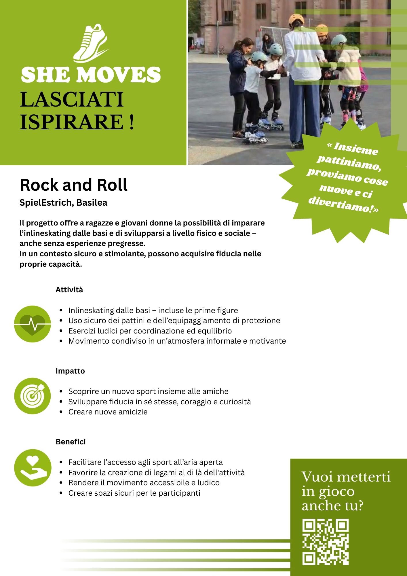 She Moves è un programma speciale di Kebab+ che, dal 2025 al 2027, intende concentrarsi su progetti per la promozione del movimento di ragazze, giovani donne e persone che si identificano nel genere femminile, affrontando le disuguaglianze di genere nell’ambito dell’attività fisica. Studi dimostrano che alle giovani donne* spesso mancano spazi sicuri e inclusivi, così come modelli di riferimento che le incoraggino a muoversi.